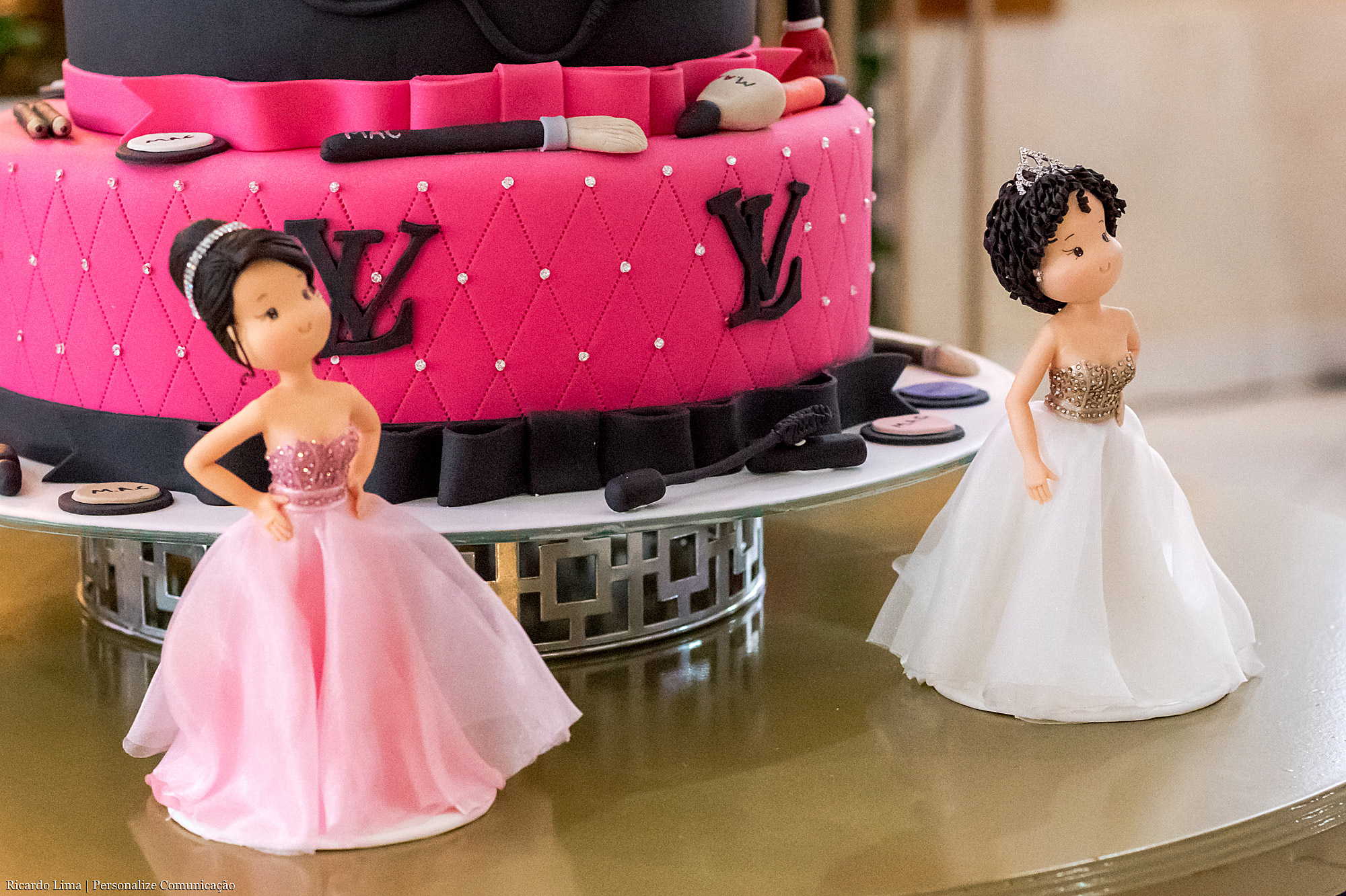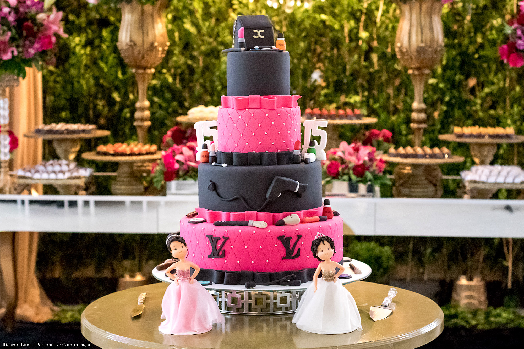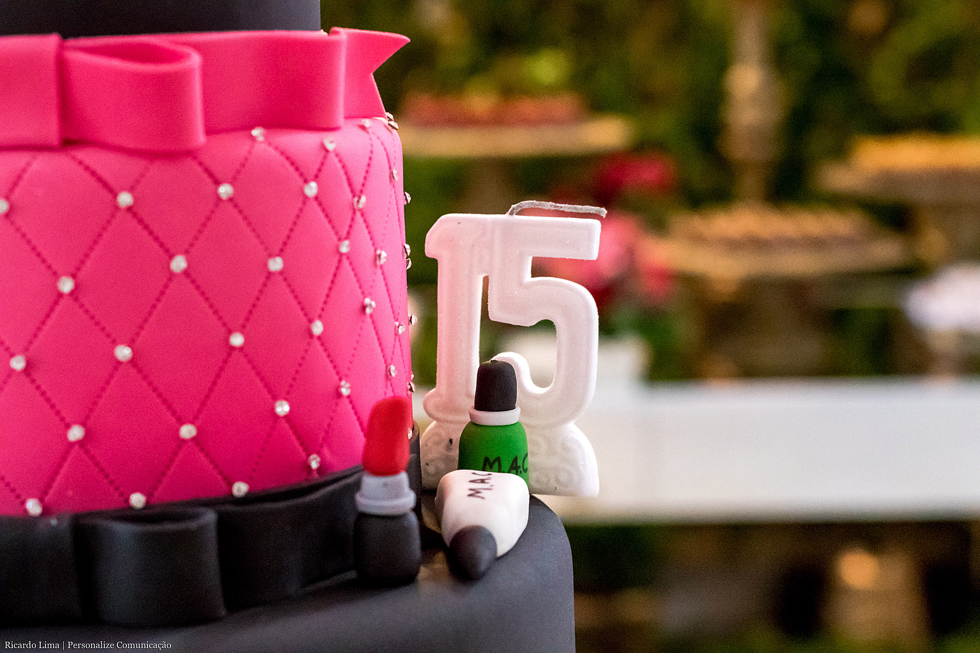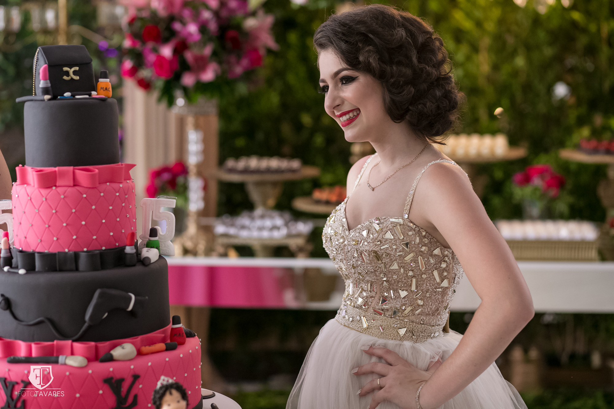 O tema escolhido foi o da maquiagem, uma das coisas que as adolescentes mais amam. Para combinar com a decoração, o bolo cenográfico foi produzido nas cores pink e preto intercaladas. Na camada rosa, pedrinhas de strass foram usadas para embelezar e deram um charme especial.