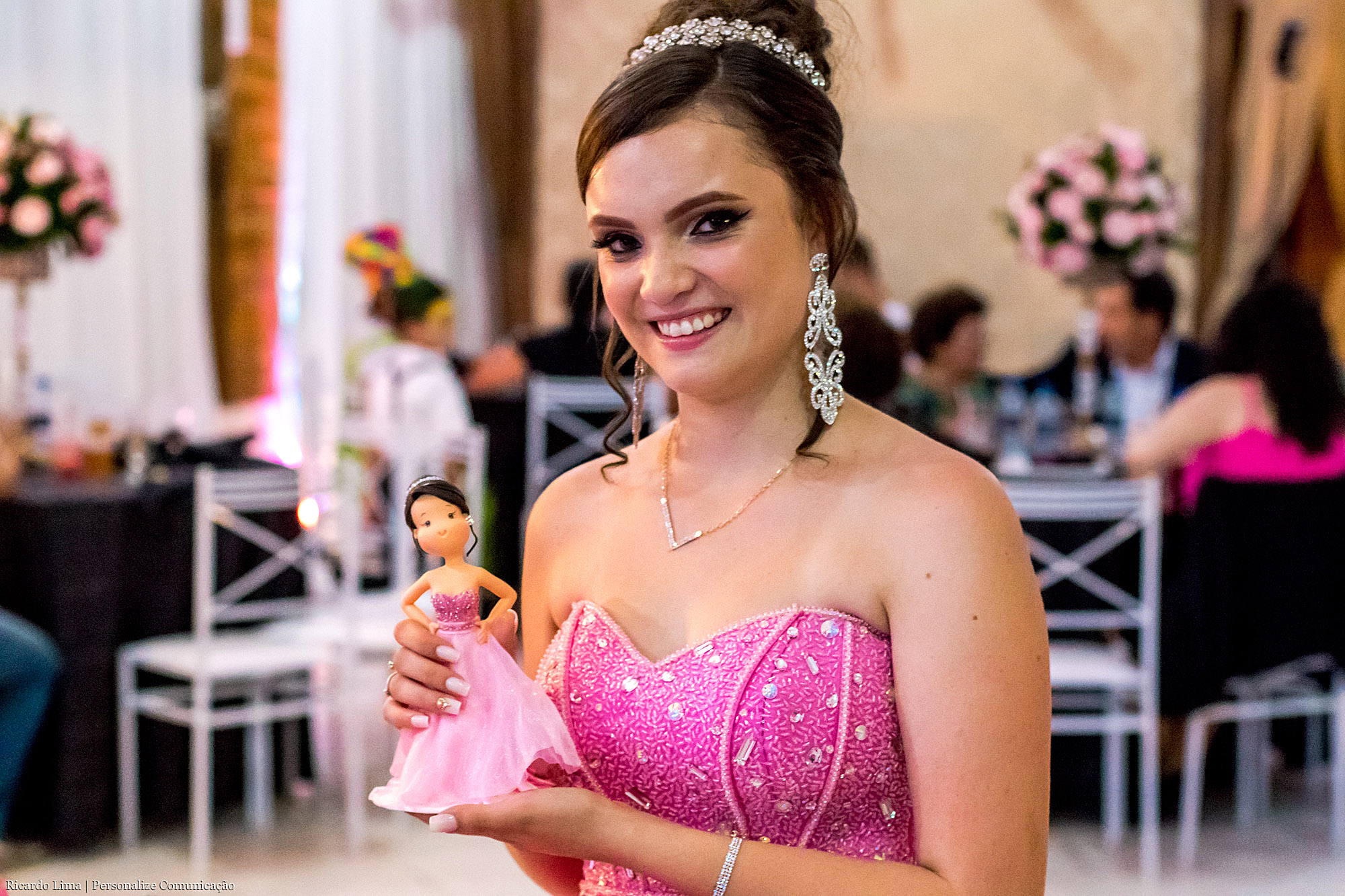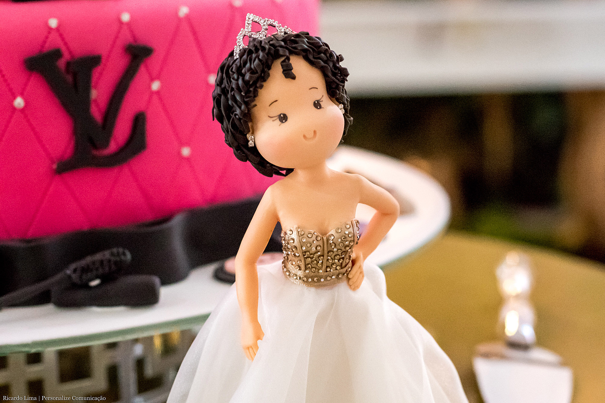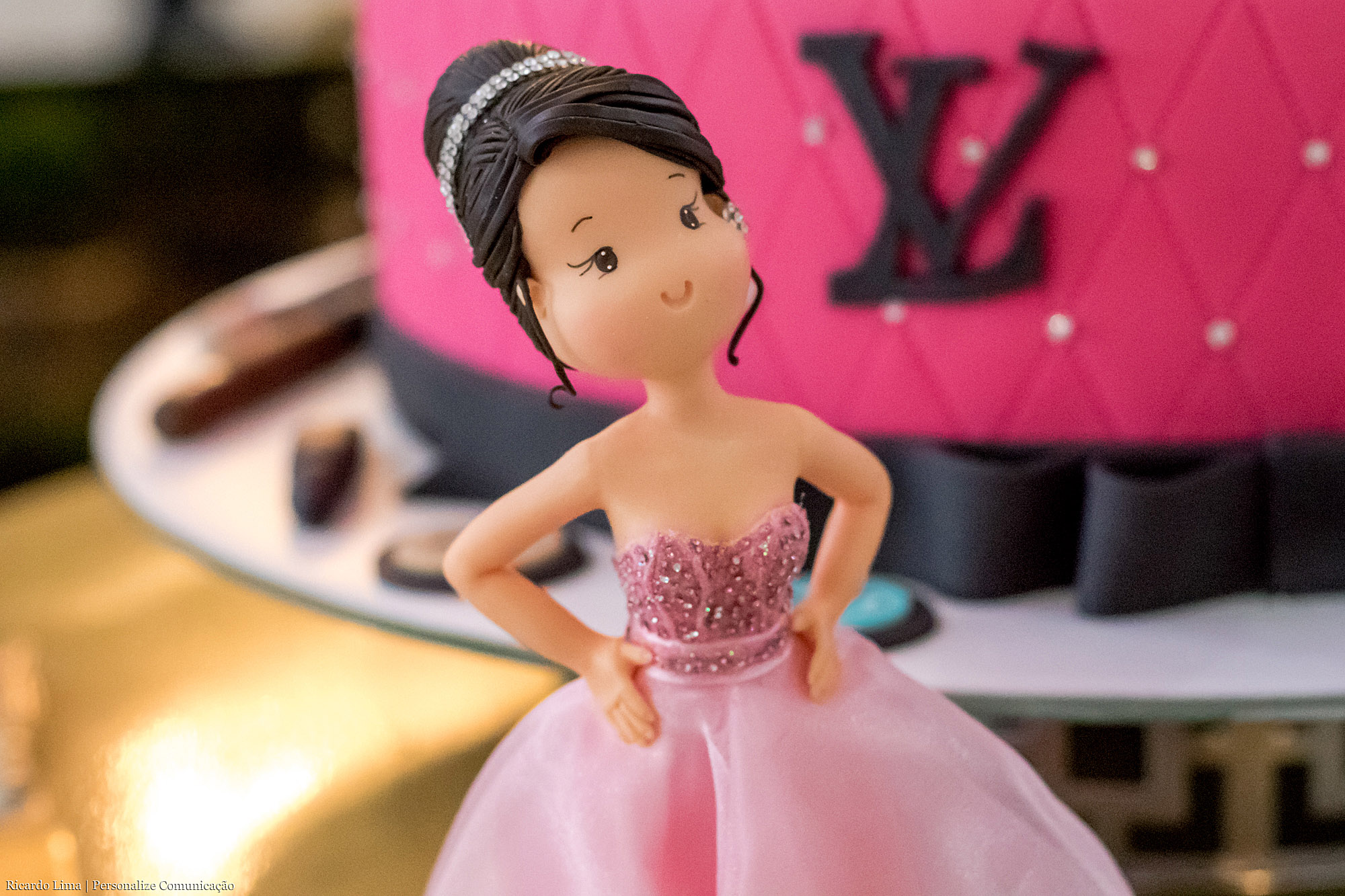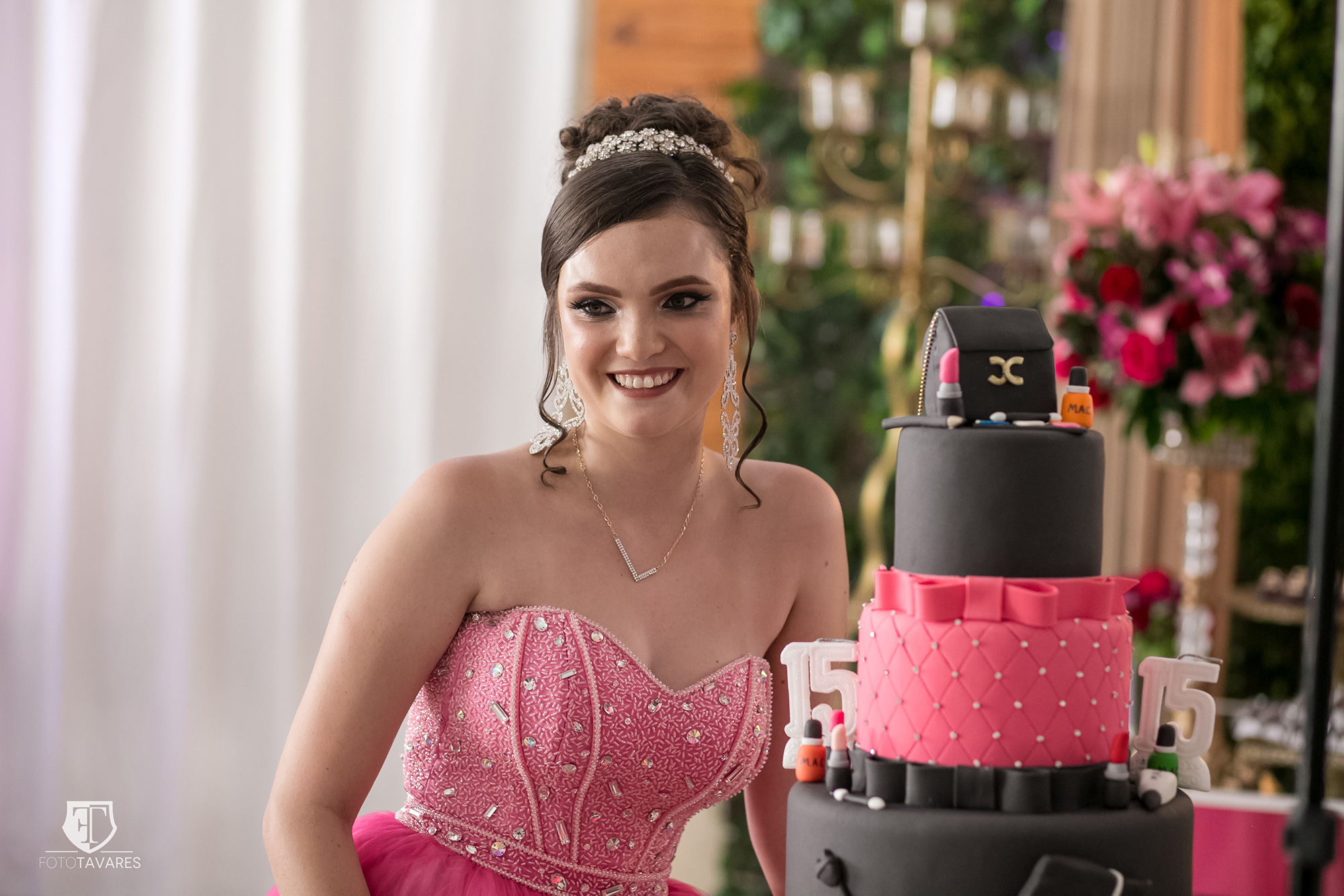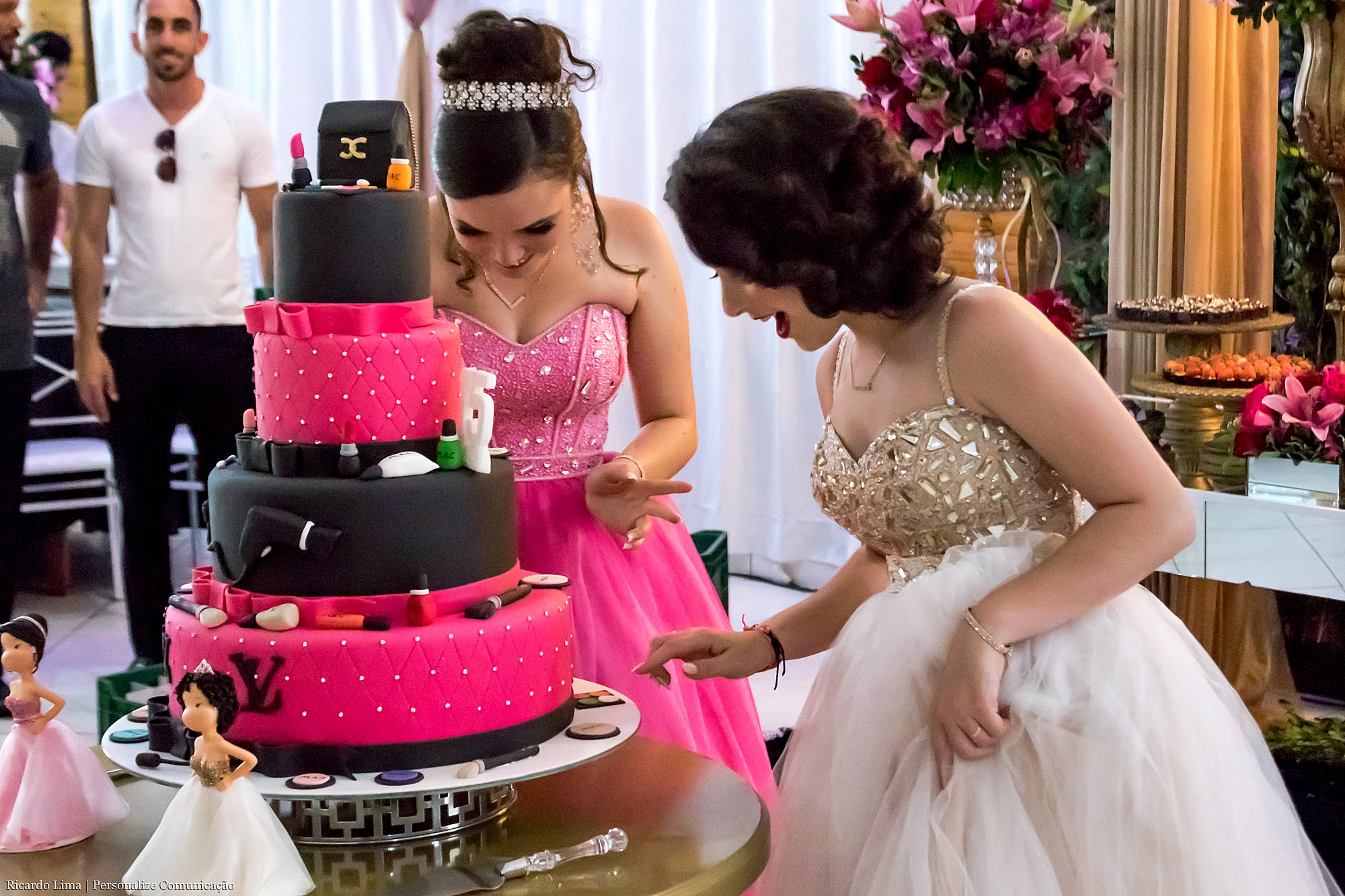 O tema escolhido foi o da maquiagem, uma das coisas que as adolescentes mais amam. Para combinar com a decoração, o bolo cenográfico foi produzido nas cores pink e preto intercaladas. Na camada rosa, pedrinhas de strass foram usadas para embelezar e deram um charme especial.