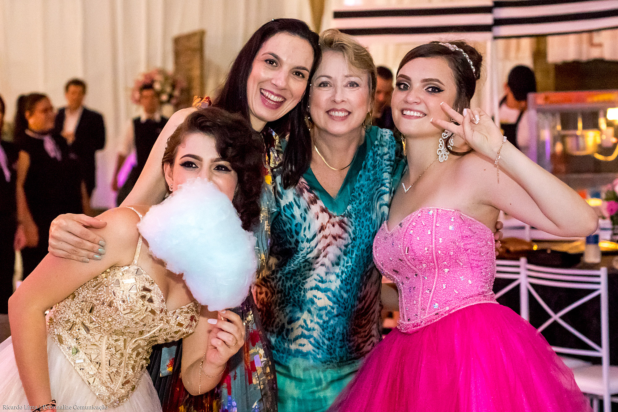 Antes de iniciar a festa, as jovens posaram para fotos ao lado do bolo cenográfico e se divertiram muito fazendo diferentes poses.