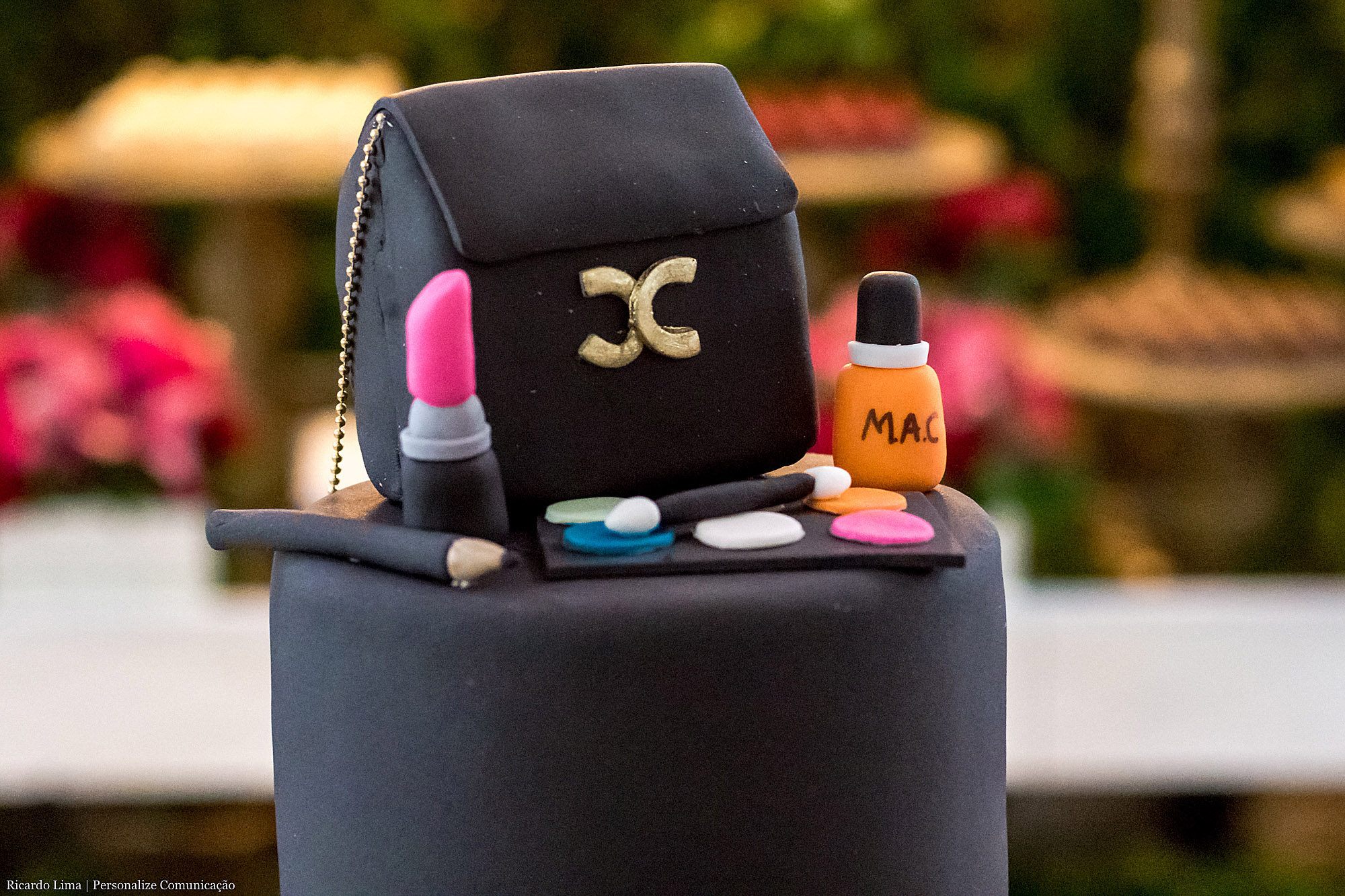 Feitos de pasta americana, os enfeites que imitam os itens de cosméticos foram distribuídos nos quatro andares do bolo. Dentre outros, não faltaram o rímel, o batom e o esmalte.
