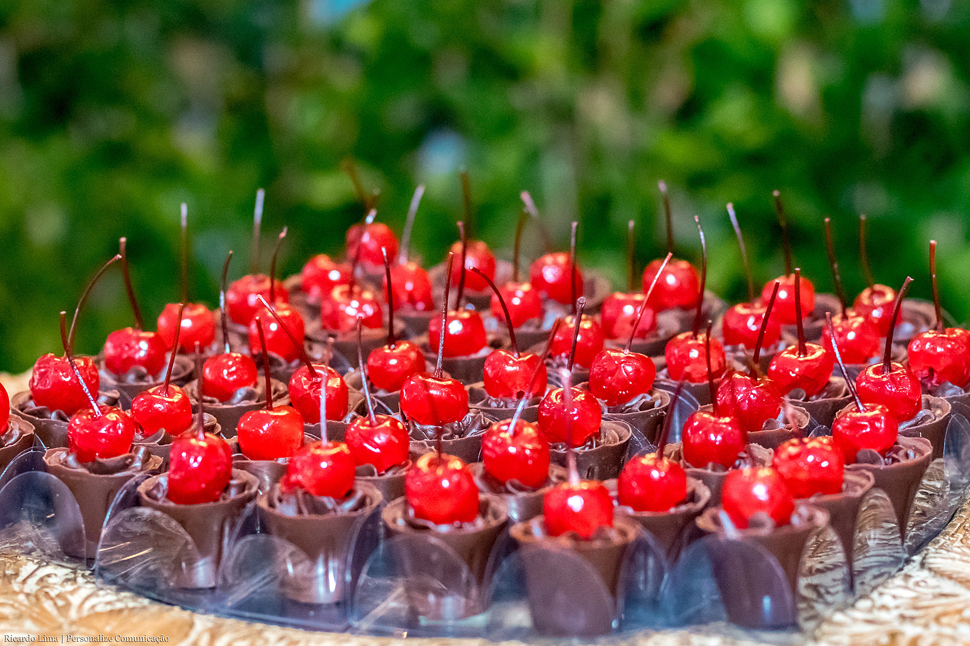 Magda explica que foram feitos docinhos tradicionais e finos. Dos tradicionais, o que as adolescentes mais gostam são o brigadeiro, casadinho e churros. Magda preparou ainda os doces finos que incluem um ingrediente que as garotas amam: o chocolate. Com este nobre item foram feitos docinhos em formato de caixinha e com recheio de maracujá e framboesa; physalis (parecem micro laranjas) no copinho de chocolate, pérolas e avelã, dentre outros.