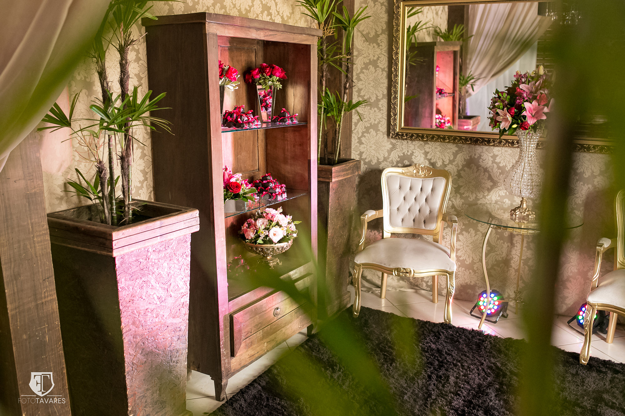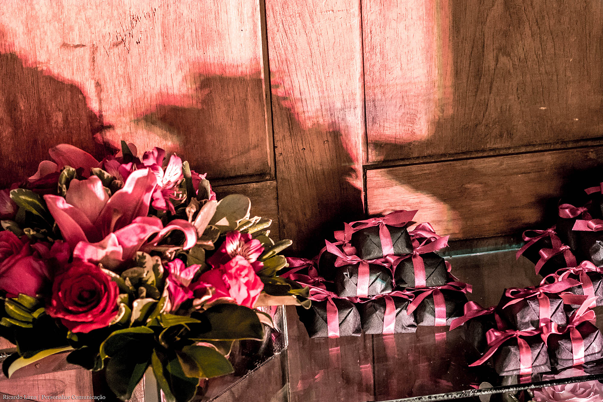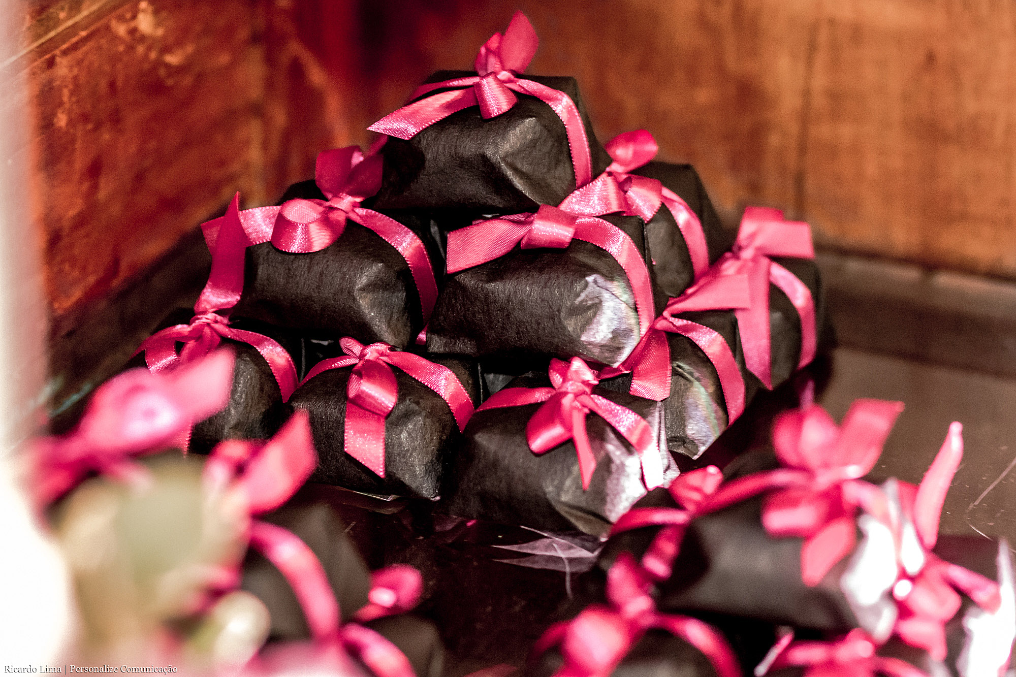 Os mimos foram delicadamente embrulhados e ornamentados com charmosas fitas rosa pink e preto para combinar com o ambiente e estilo da festa. Os mimos foram colocados em lugar de destaque no hall de entrada do salão de festas, numa linda estante de madeira enfeitada com delicadas flores.