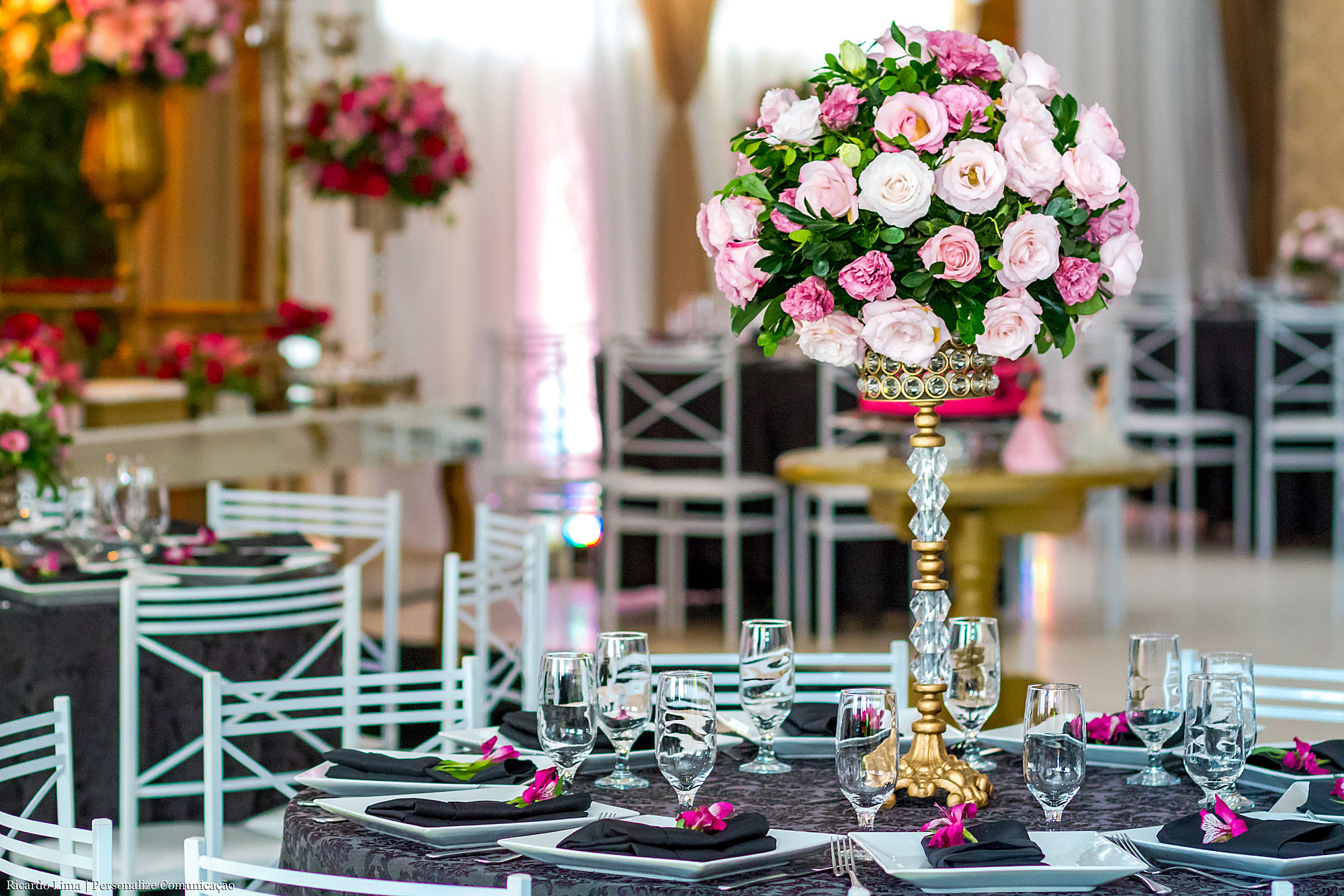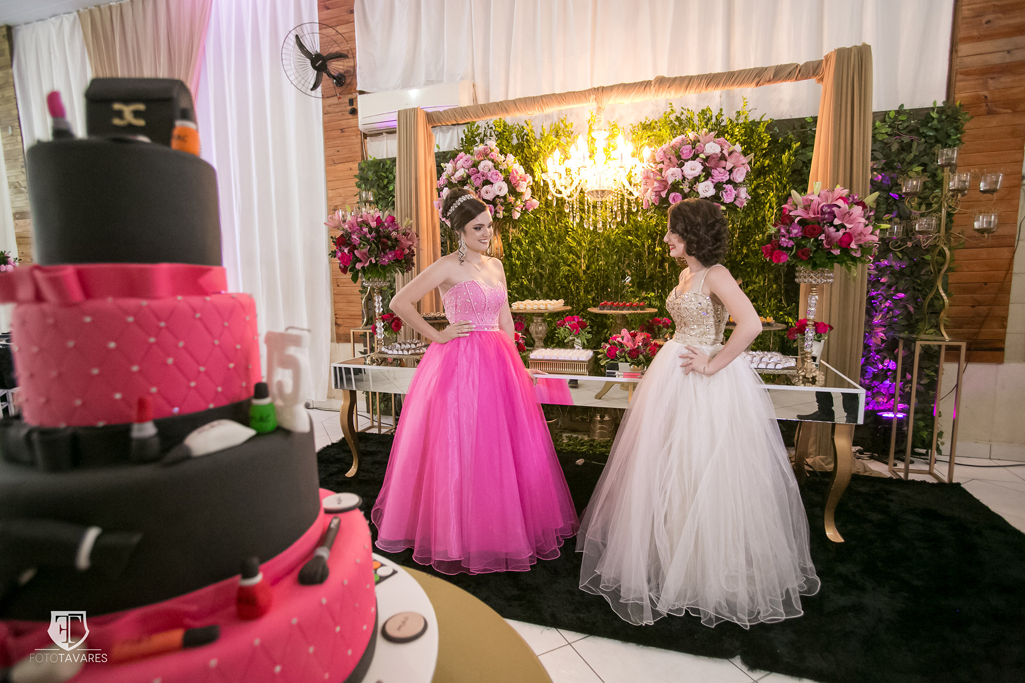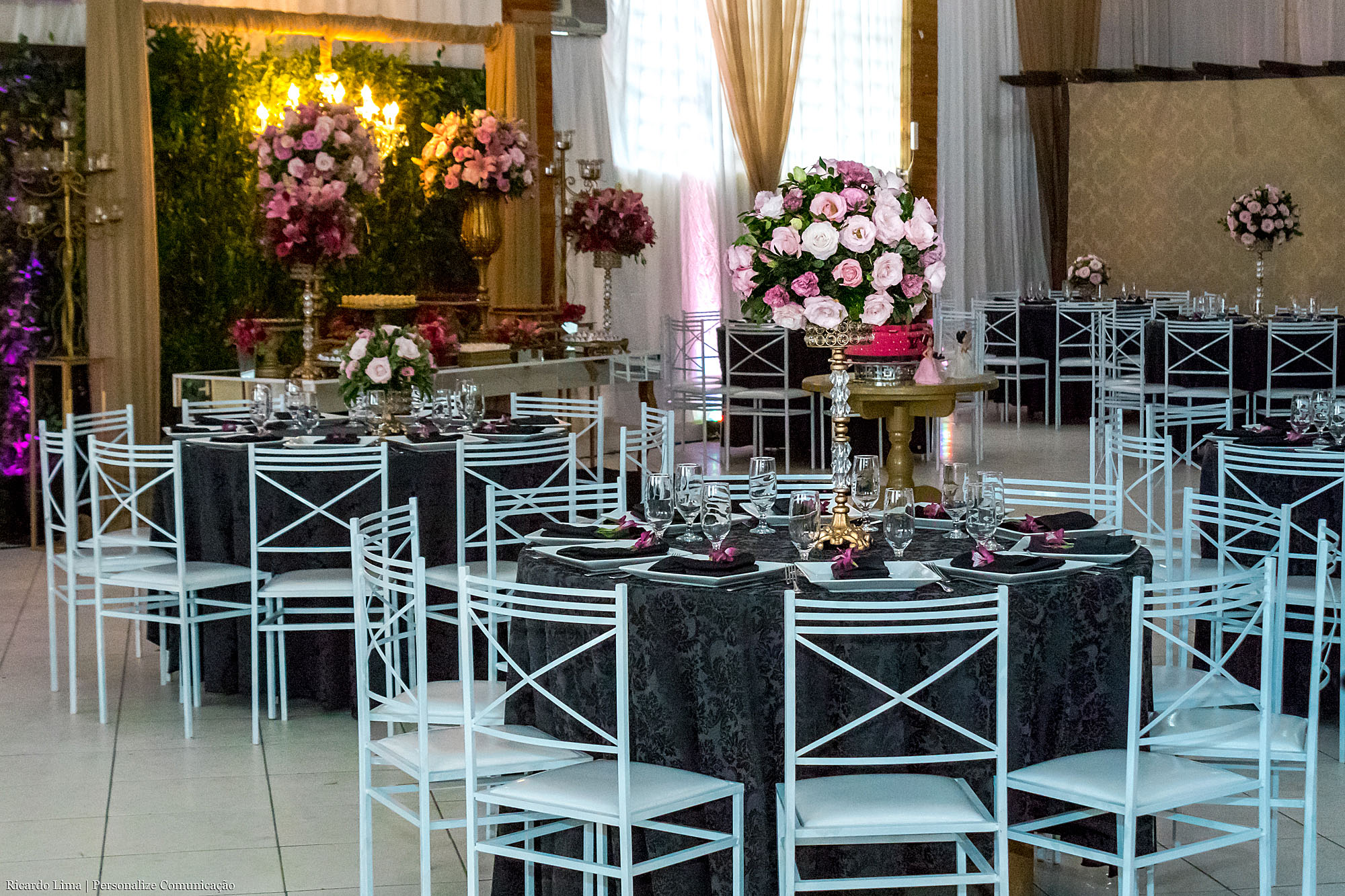 As cores predominantes do tema foram o preto e o rosa pink. As decoradoras distribuíram as cores em diferentes objetos: nas toalhas de mesas, nas flores, na mesa de doces. Móveis em dourados com espelhos, plantas e cortinas em voal completaram o estilo da decoração.