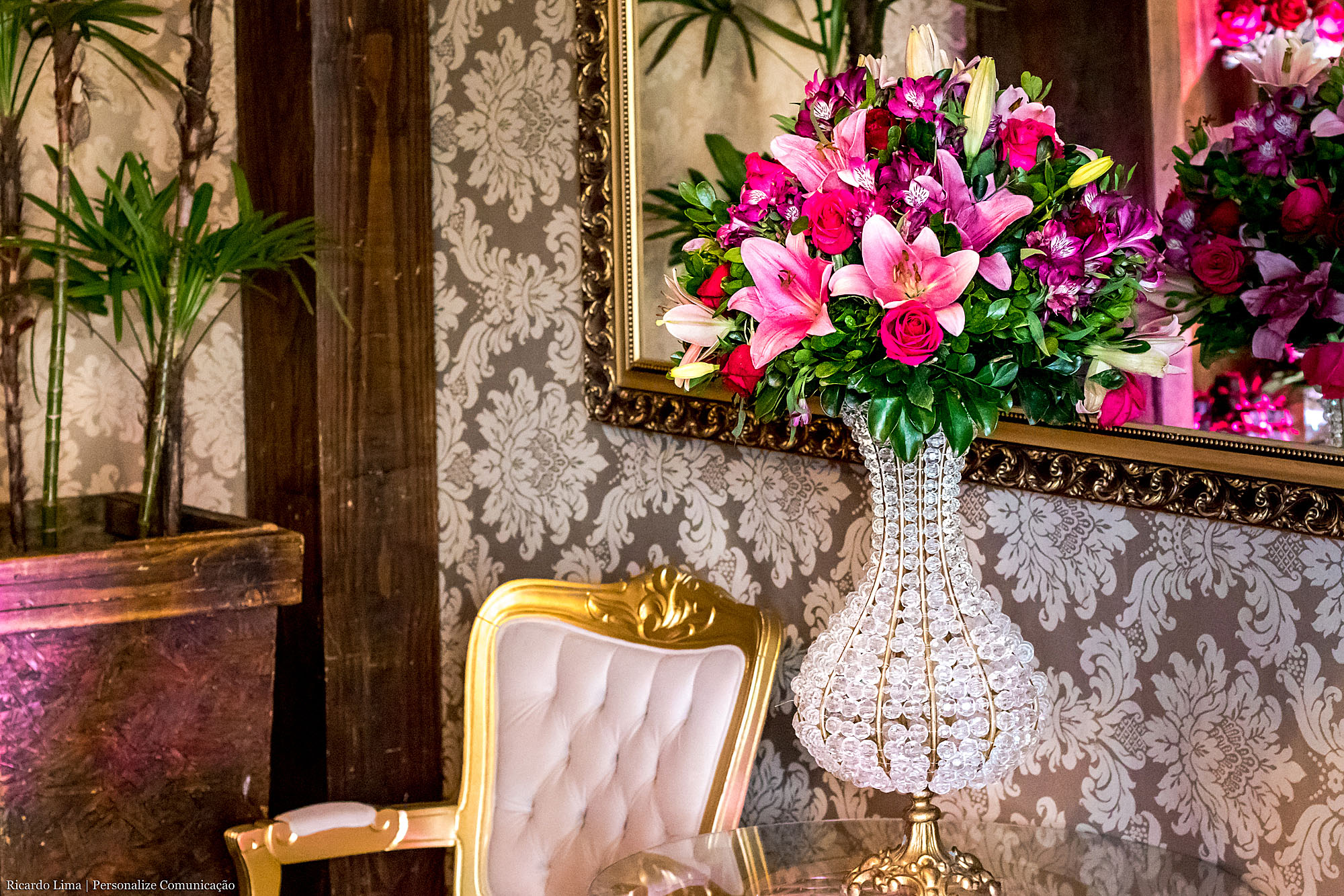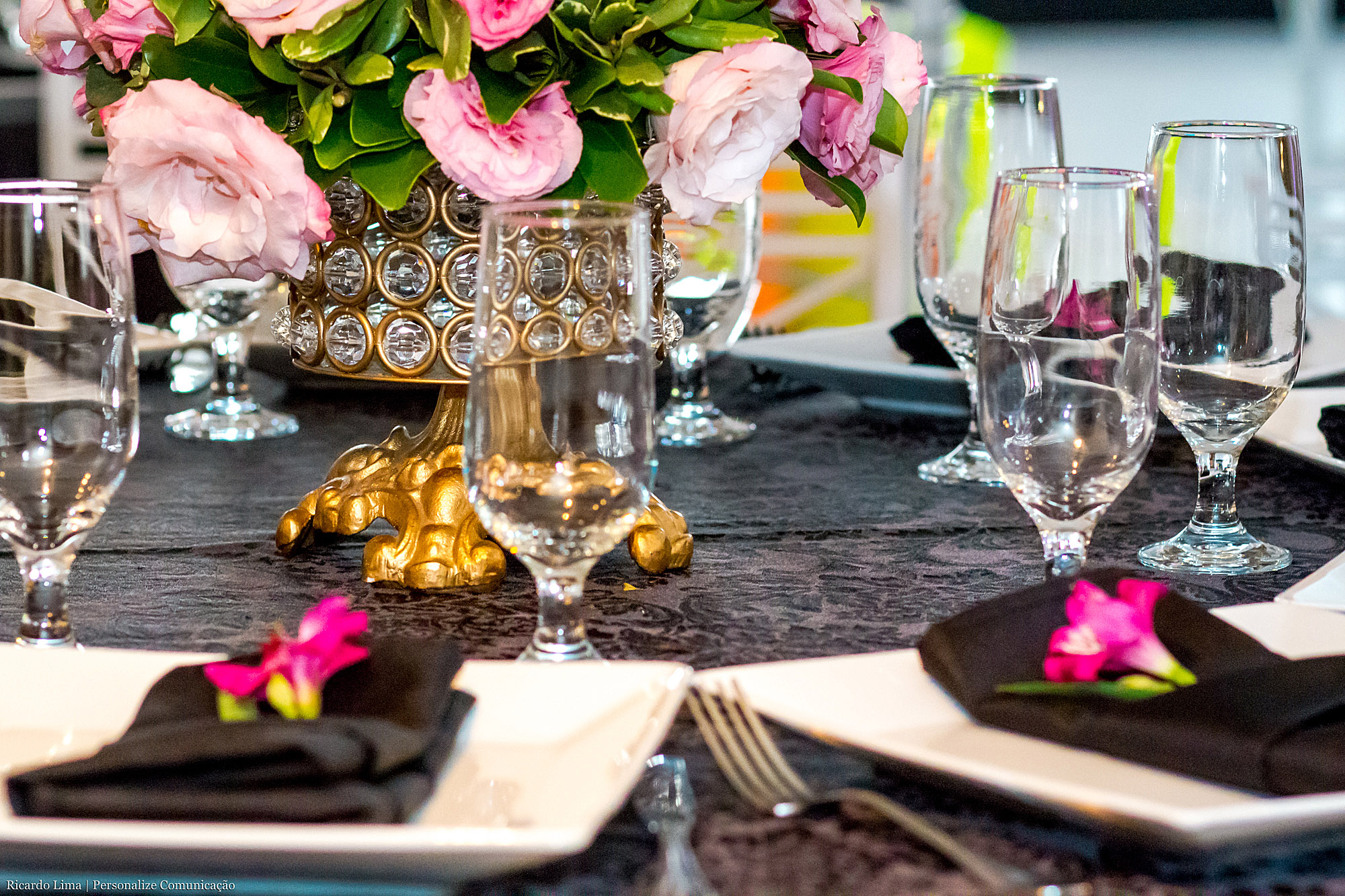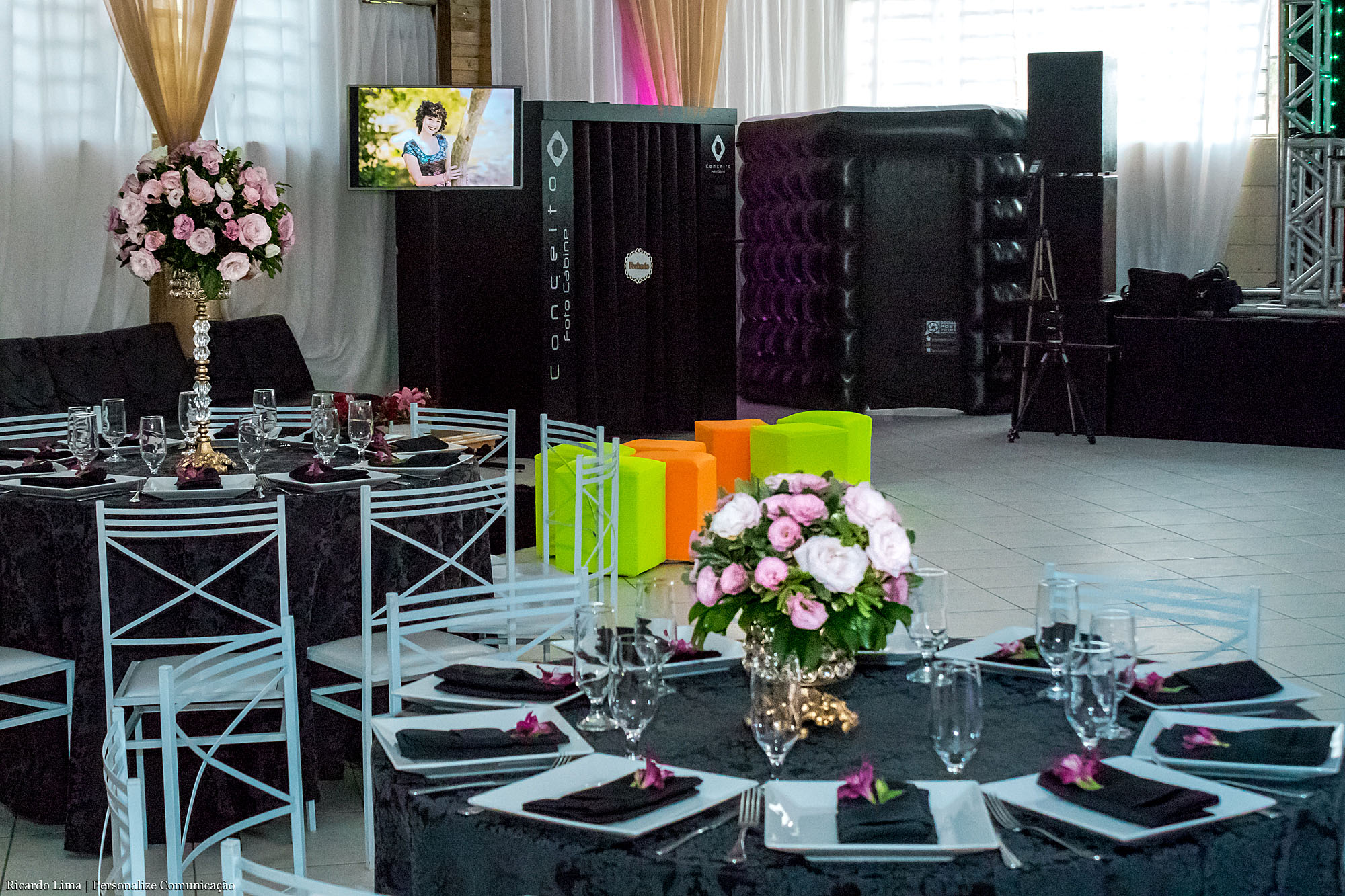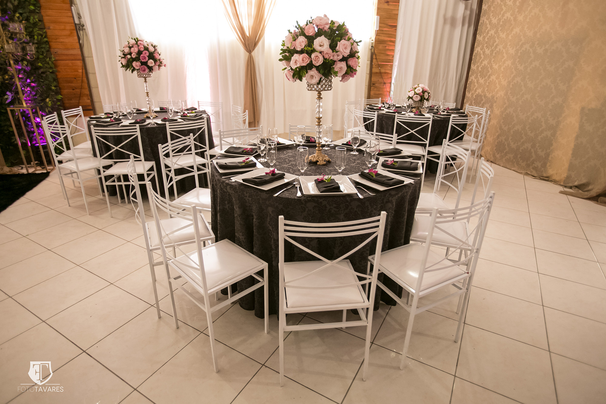 As cores predominantes do tema foram o preto e o rosa pink. As decoradoras distribuíram as cores em diferentes objetos: nas toalhas de mesas, nas flores, na mesa de doces. Móveis em dourados com espelhos, plantas e cortinas em voal completaram o estilo da decoração.