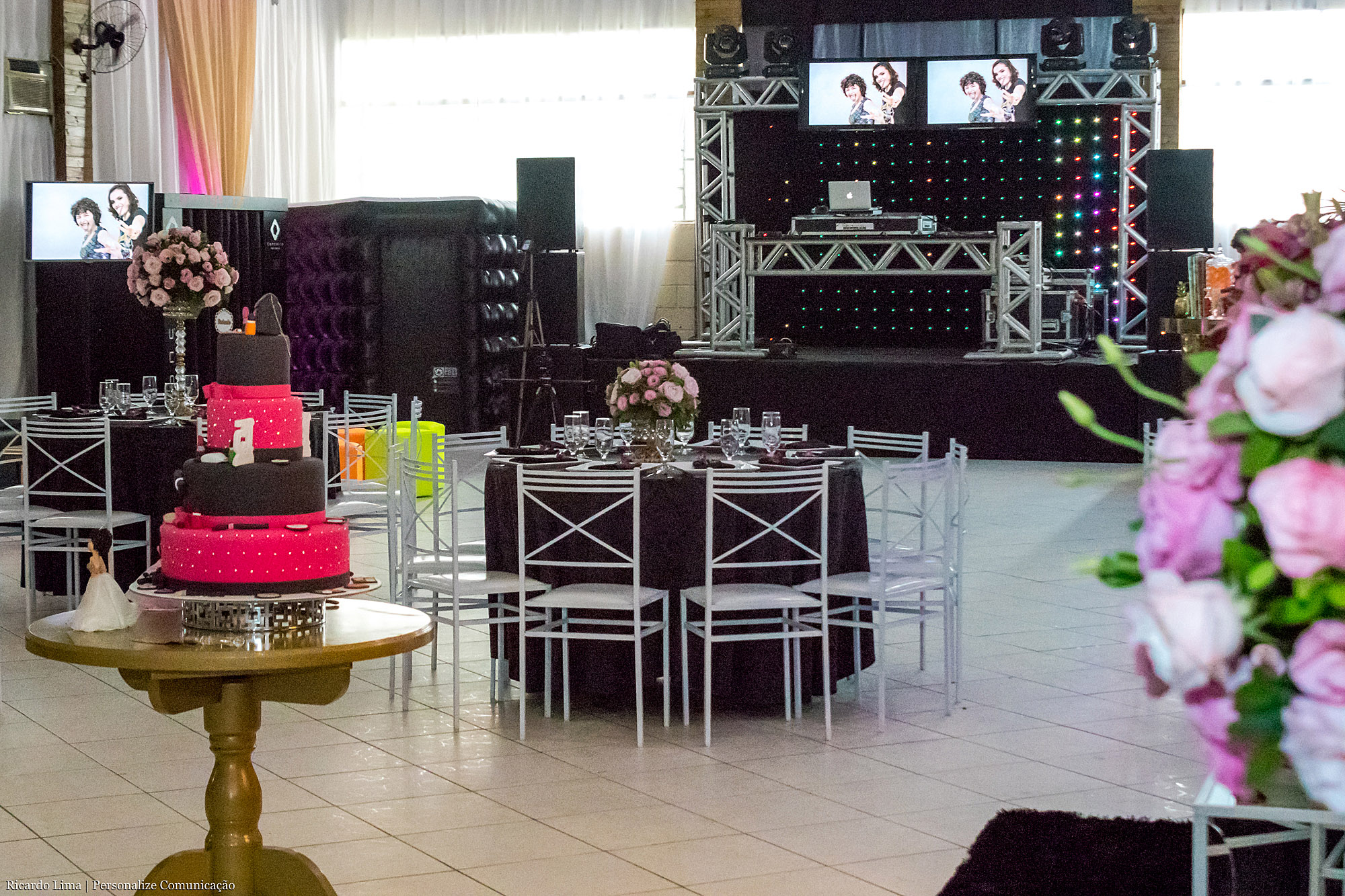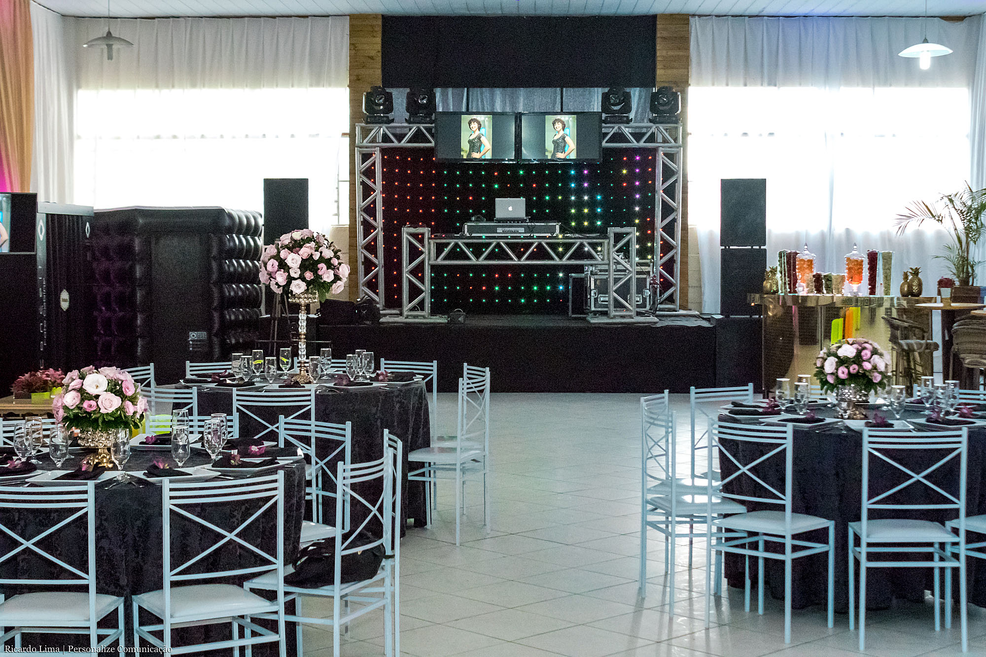 O sofá ficou de frente para o espaço livre disponível para que as aniversariantes e os convidados pudessem dançar e curtir as músicas de frente para o palco, montado ao fundo para os equipamentos do DJ. Três monitores mostravam fotos do ensaio fotográfico do qual as adolescentes participaram em setembro.