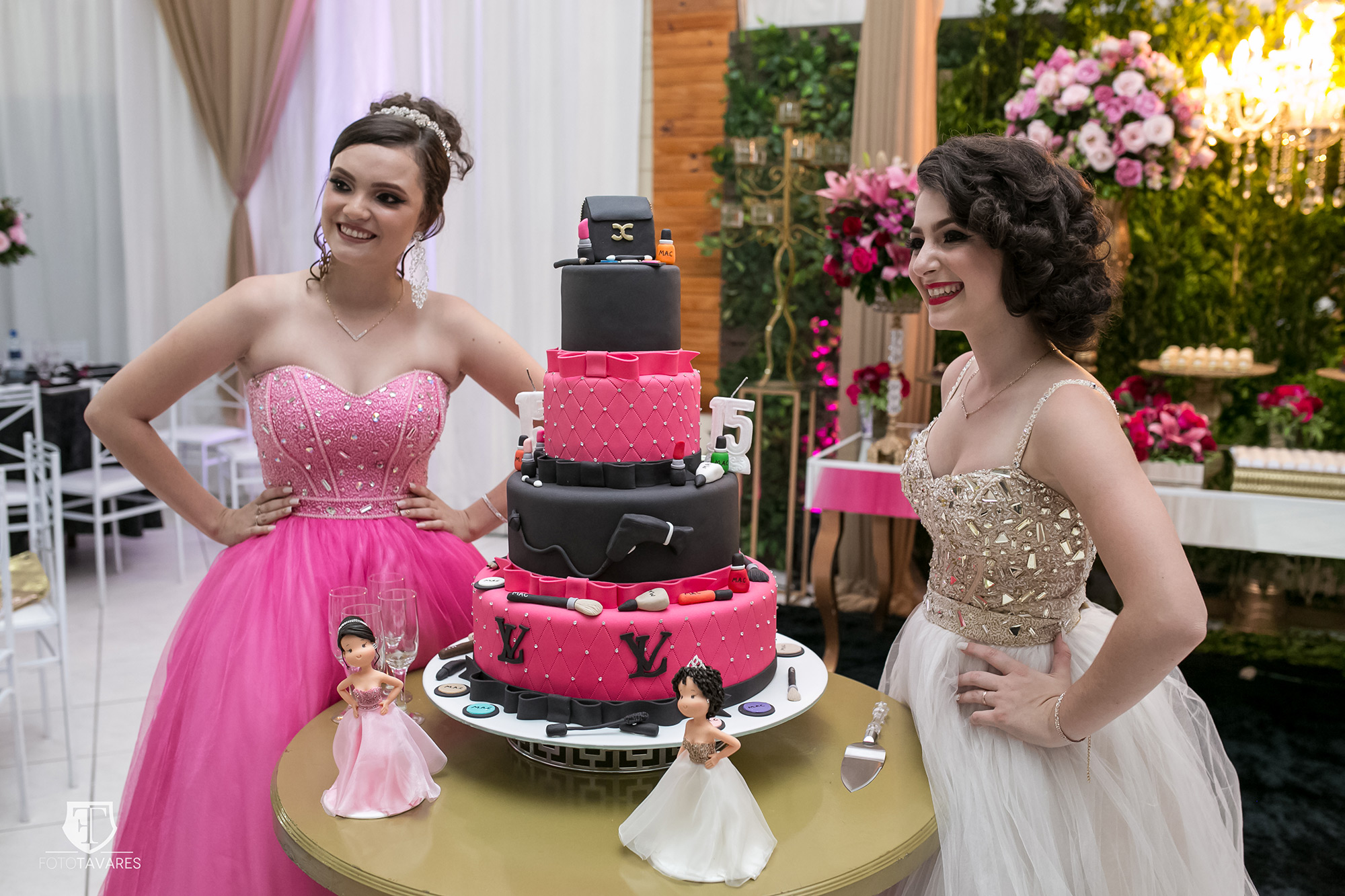 No centro do salão, as mesas do bolo e de doces ficaram deliciosamente atraentes. A do bolo ficou em destaque numa linda peça de madeira. O tema escolhido foi o da maquiagem. Para deixar a mesa ainda mais graciosa foram usadas as bonequinhas em biscuit, representando as debutantes,  produzidas pela artesã Fernanda Tavares.