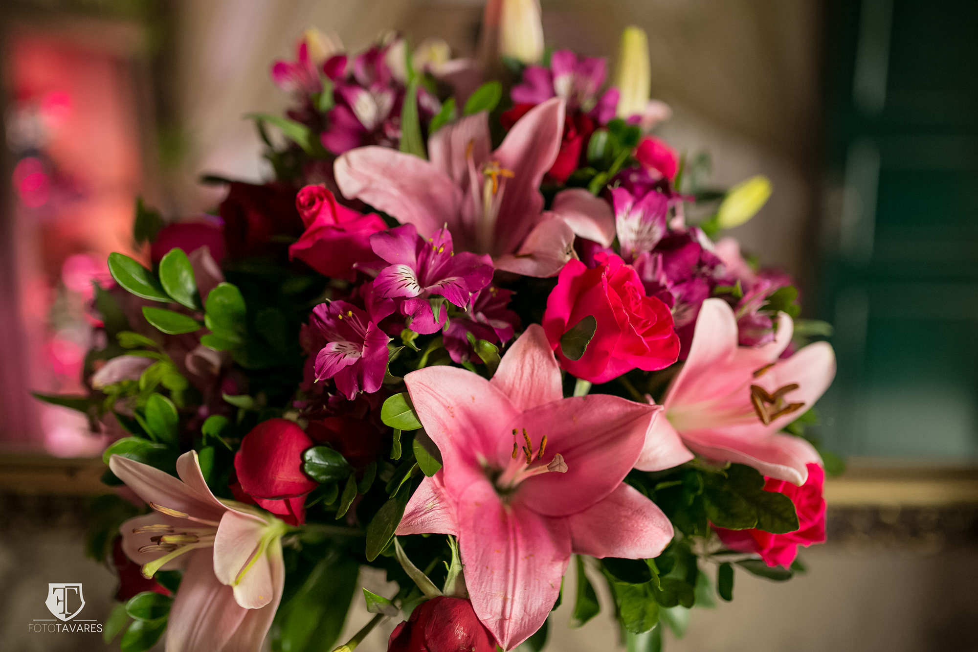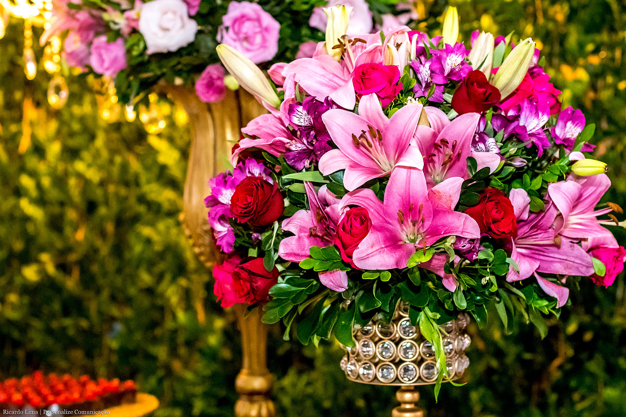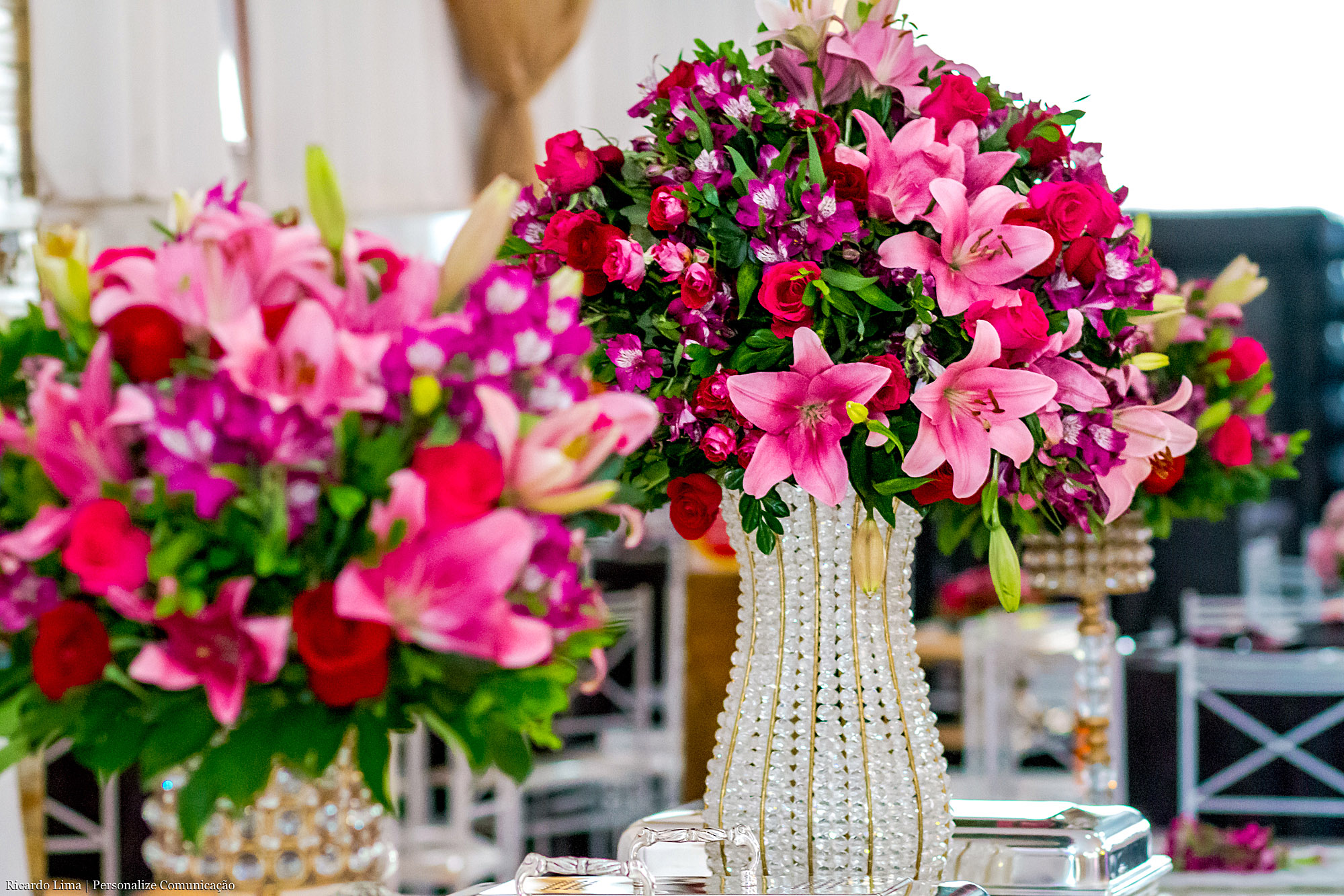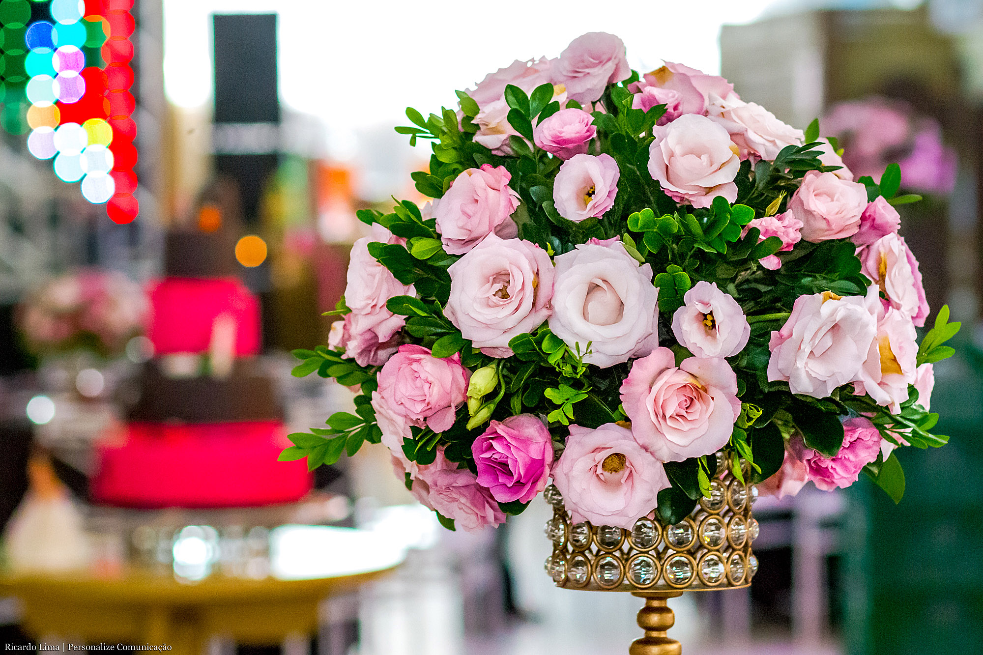 Em diferentes espaços, em mesas e aparadores foram utilizadas delicadas flores: rosas, astromélias e lisianthus, que deram charme e elegância a cada cenário.