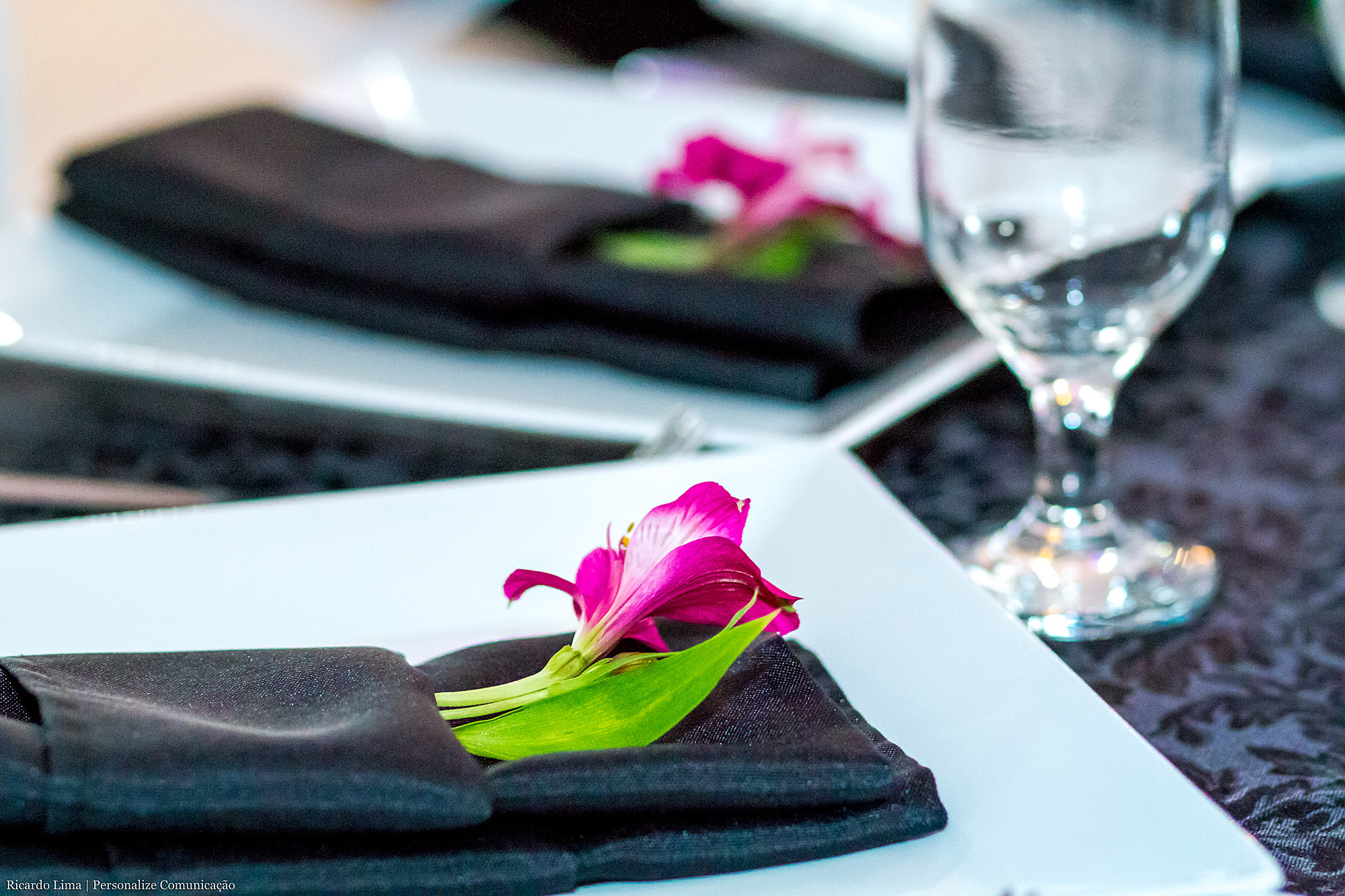 As mesas para o jantar foram decoradas com lindos vasos de flores em tons de rosa. Os pratos escolhidos foram os quadrados. Sobre eles, talheres organizados em guardanapos de pano pretos e dentro deles, uma delicada flor enfeitou o prato de cada convidado.