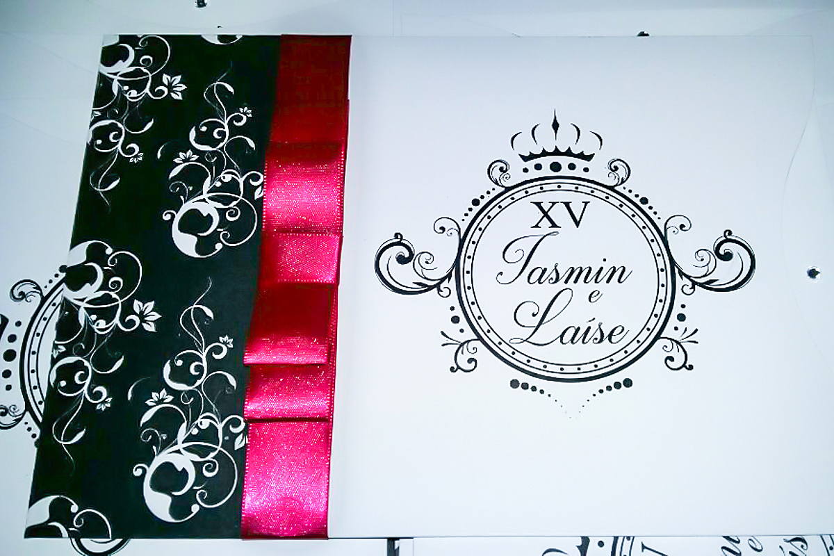 Michela mostrou às adolescentes diferentes opções de monogramas, cores, fontes tipográficas e formatos de convites. As aniversariantes escolheram as cores preta e rosa pink para combinar com os tons da decoração e também definiram o estilo do monograma.